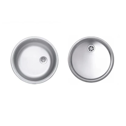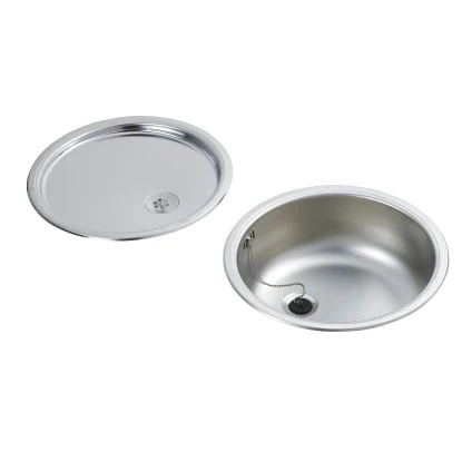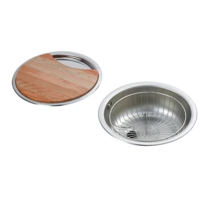 Das Rundbecken-Set besteht aus einer runden Edelstahlspüle, einem runden Abtropfbecken, einem Geschirrkorb und einem Schneidebrett. Es ist für Unterschränke ab 45 cm geeignet.